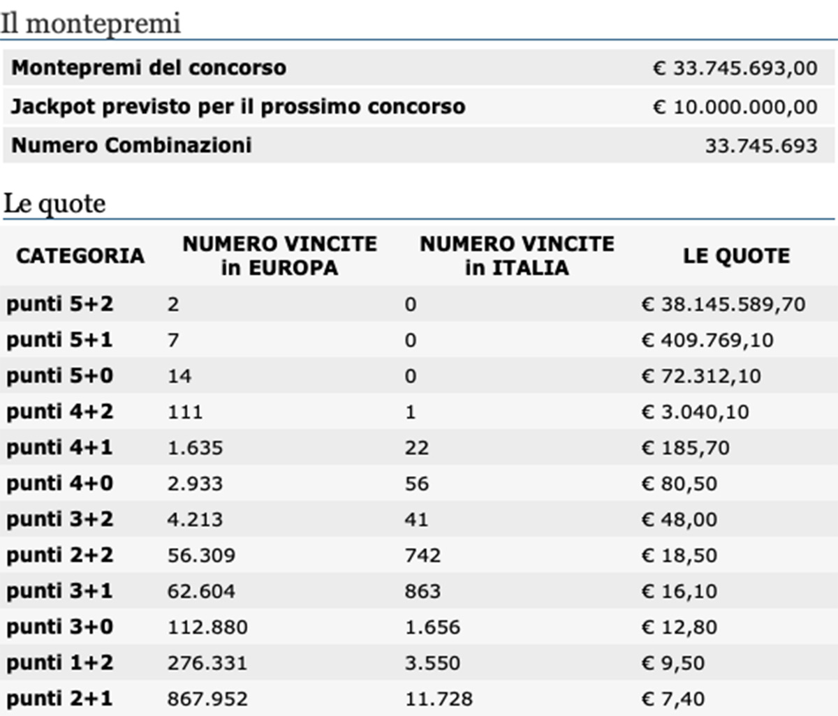 Combinazione Euro Jackpot: quote e premi del concorso