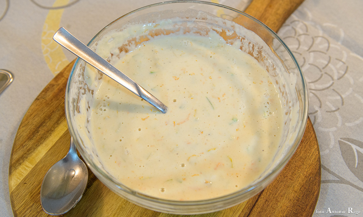 Impastare con una frusta a mano fino ad ottenere una pastella liscia e omogenea.