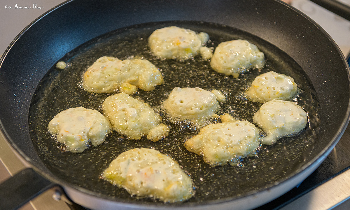 Intanto, scaldare l’olio di semi in una padella e non appena sarà alla temperatura corretta, con la punta di un cucchiaio, prelevare una piccola quantità di pastella e immergerla nell’olio. Durante la cottura le frittelle si gonfieranno e saliranno a galla.