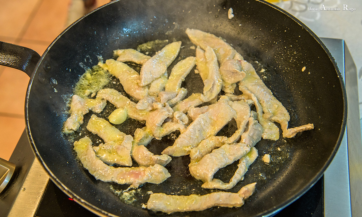 A parte, stufare la carne con olio a fuoco basso e con un aglio intero da togliere prima di servire.