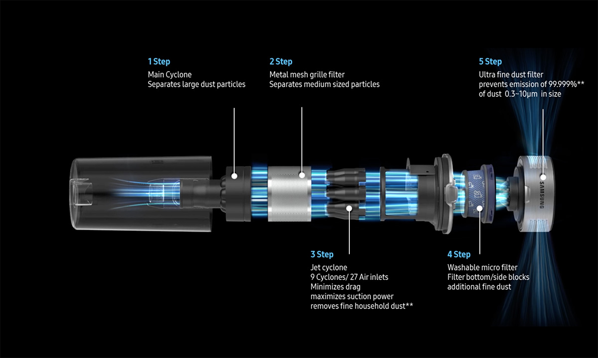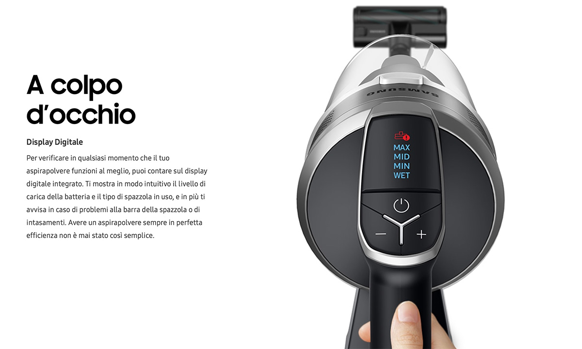 Il nuovo aspirapolvere Samsung jet 75 premium raccoglie tantissime recensioni positive da parte di chi l’ha usato e le opinioni degli utenti sono tutte ben disposte. Soprattutto in estate, le case e gli ambienti domestici, sono sempre più polverosi e sporchi. Colpa delle finestre aperte, probabilmente, che lasciano via libera anche ad acari e batteri di ogni genere. L’aspirapolvere senza filo targata Samsung è un valido alleato in tale senso. Dotato di 200 W di potenza di aspirazione, potrebbe essere ciò di cui hai veramente bisogno. Dal punto di vista del design, il Jet 75 è elegante e versatile. Ha una batteria removibile che si inserisce nella base del suo manico e può essere ricaricata con il meccanismo a parete. Sopra la maniglia ci sono un pulsante di accensione, un pulsante più e uno meno, per regolare la potenza, usando solo il pollice.