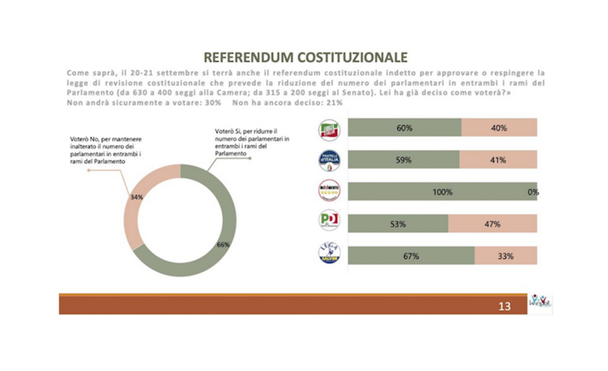 Sia Forza Italia che Fratelli d’Italia hanno una relativa maggioranza di Sì al 60% contro il 40% di No. Situazione non troppo diversa nel Carroccio che ha un 67% di votanti Sì e il restante 33% si proclama a sfavore. Non una decisione così radicale quindi tra le forze politiche, così come in casa dell’altra forza di governo, il PD. Il 53% dei democratici voterà Sì e il 47% No.