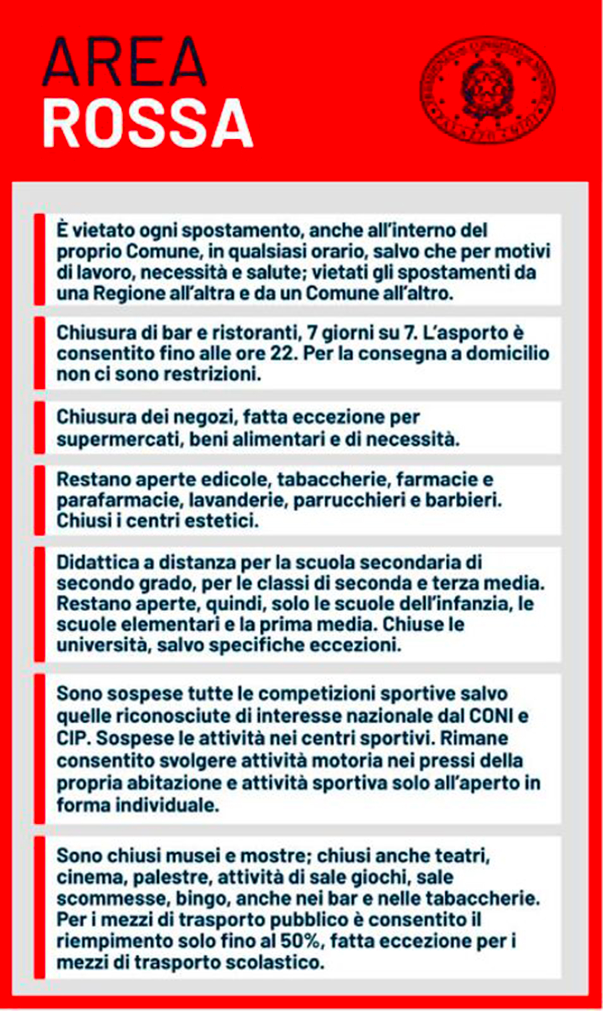 Al di là delle restrizioni sulla mobilità, sono stati istituiti vari divieti in zona rossa. Alcuni riguardano altri aspetti della mobilità, altri settori completamente diversi.