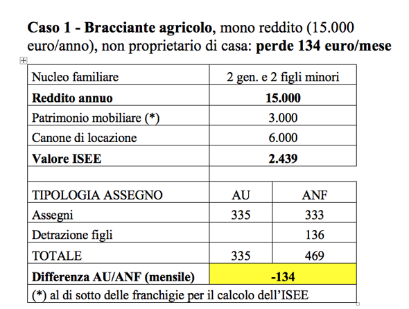 - 1° CASO: Famiglia di bracciante agricolo monoreddito (15mila euro/anno)