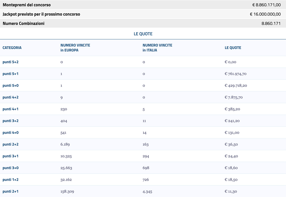 Nell’attesa di conoscere i risultati ufficiali, vediamo quali sono stati i premi più ricchi centrati nell’ultimo concorso di venerdì 9 settembre 2022. Per concorse tuti i dettagli dei precedenti concorsi, riscorriamo che l’archivio 2022 sulla nostra pagina è sempre aggiornato. Intano come è facile intuire, la scorsa settimana qualcuno è riuscito ad aggiudicarsi il premio di prima categoria. Per questo motivo al sorteggio di stasera si riparte dal minimo previsto dal regolamento di gioco del valore di 10 milioni di euro.