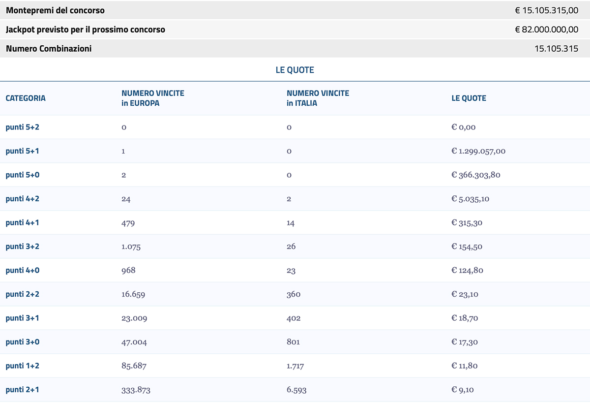 Per conoscere la tabella con gli importi delle vincite bisogna attendere le 21.00. Questo è l’orario in cui Sisal rende note quelle che sono le quote relative al concorso 71 22. Per avere diritto alla riscossione di uno dei premi in palio oggi 18/10/2022, bisogna indovinare almeno tre numeri vincenti della combinazione vincente. Si ha una possibilità su 42 di indovinare la combinazione punti 2 + 1 che è in genere quella cui corrisponde il premio in denaro più basso. All’11ª categoria di premi corrisponde invece la combinazione 1 + 2. In questo caso le probabilità di vincita sono una su 128. Invece chi indovina la combinazione punti 3 + 0 ha diritto alla riscossione del premio di 10ª categoria, per il quale sono previsti una possibilità su 344. In tutto ci sono 12 categorie di premi. Le probabilità di indovinare combinazioni numeriche più elevate, aumentano in maniera esponenziale per le combinazioni più prossime a quella vincente. Basti pensare che le probabilità di vincita di indovinare il 5 + 2 sono una su 95.344.200.