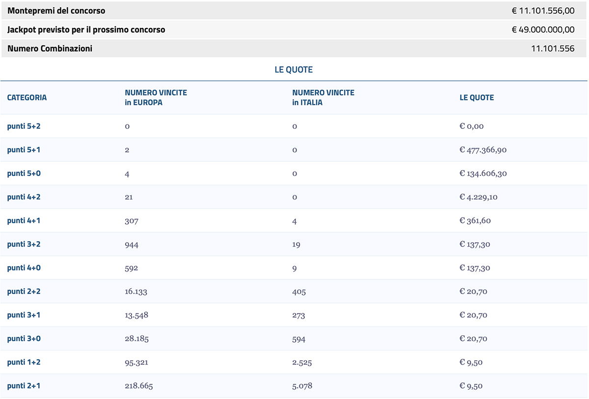 Dalle ore 20.15 sarà possibile aggiornare questa pagina per conoscere la combinazione vincente. Il risultato il concorso 67 22 potrà essere quindi conosciuto live proprio con la Finlandia. Ogni settimana i numeri vincenti dsono estratti ad Helsinki, capitale della Finlandia. Anche stasera martedì 4 ottobre 2022 l’estrazione Eurojackpot in diretta consente di verificare la vincita in tempo reale. Il regolamento prevede che la partecipazione in ricevitoria possa avvenire attraverso la scheda con un solo pannello. Ma nel regolamento inoltre prevista la possibilità di giocare sistemi integrali, ridotti e a caratura. Inoltre, come per le altre lotterie proposte dal gruppo sisal, è possibile tentare la sorte anche attraverso le giocate on-line.