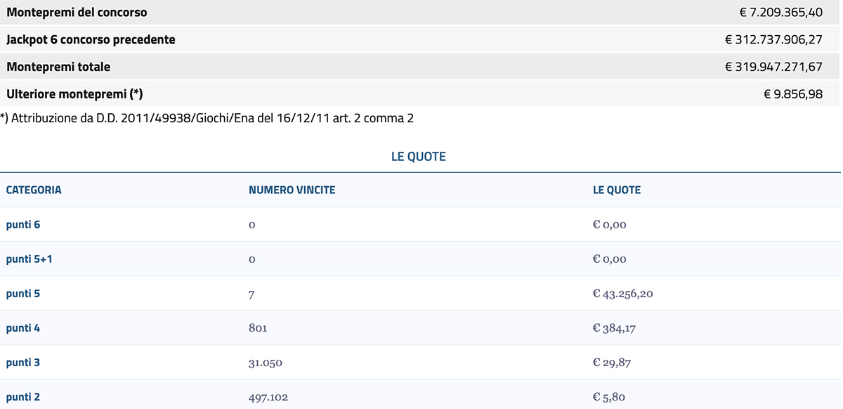 Scopri i numeri delle estrazioni del Lotto in diretta live, su questa pagina verifica i risultati di  Lottomatica e Sisal. Con l’aggiornamento in tempo reale per conoscere gli ultimi estratti come in streaming video. I numeri del Superenalotto 24 novembre 2022 valgono oltre 310 milioni di euro. Ma se fare sei è complicato, ci sono anche le quote di importo inferiore che possono essere centrate con 5, 4, 3 oppure anche 2 numeri.