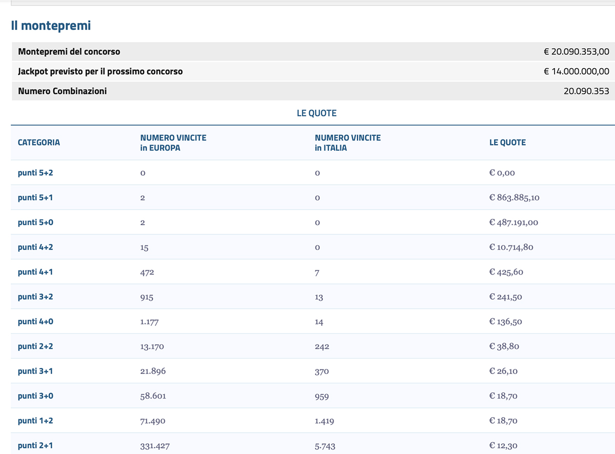 I premi saranno pubblicati pochi minuti dopo i risultati Eurojackpot stasera venerdì 23 dicembre 2022. La riscossione si effettua presso il punto di vendita nel quale è stata effettuata la giocata e nei punti di pagamento appositamente abilitati dal Concessionario, nei casi in cui l’importo della vincita sia compreso tra euro 520,01 e euro 5.200,00, che provvedono al pagamento in contanti o con assegno bancario di conto corrente o circolare non trasferibili. Altrimenti presso i punti di pagamento appositamente abilitati dal Concessionario, nei casi in cui l’importo della vincita sia compreso tra euro 5.200,01 e euro 52.000,00, che provvedono alla prenotazione del bonifico bancario il cui pagamento avviene entro trenta giorni solari dalla consegna della ricevuta.