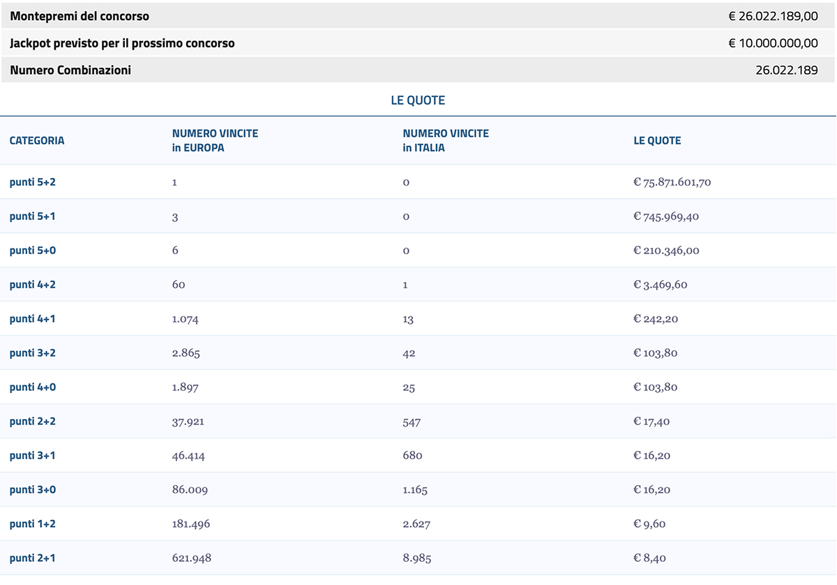 Le vincite dell’Eurojackpot oggi si conosceranno sempre su questa pagina intorno alle 21.00. Sarà quindi necessario attendere diversi minuti prima di poter conoscere ufficialmente le quote risultanti dal concorso 86 22. Ci sono diversi modi per aumentare le proprie possibilità di vincita. Infatti è possibile prendere parte alle estrazioni anche con i sistemi integrali o con i sistemi integrali ridotti. Nel primo caso si tratta di un sistema che mette in gioco più di cinque numeri e più di due Euro numeri, e permette di generare tutte le combinazioni possibili fino ad un massimo di 32.767 combinazioni. Il sistema integrale consente quindi di realizzare delle vincite multiple, e di applicare la matematica al gioco.