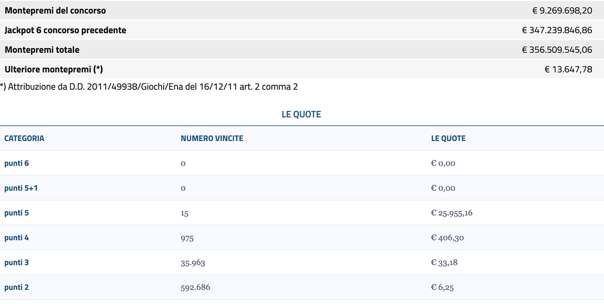 Nessun “6” nel concorso di giovedì 12 gennaio e il Jackpot vola a 348,5 milioni di euro. Sono nove i punti “5” centrati, con i fortunati vincitori che si portano a casa 35.978,20 euro a testa. Da segnalare anche due “4 stella” da 29.259 euro ciascuno. Per i risultati ufficiali delle estrazioni del Lotto in diretta bisognerà attendere le ore 20,00. Stesso orario anche per i numeri Superenalotto 14 gennaio 2023, quote e vincite invece saranno note dopo circa 30 minuti.