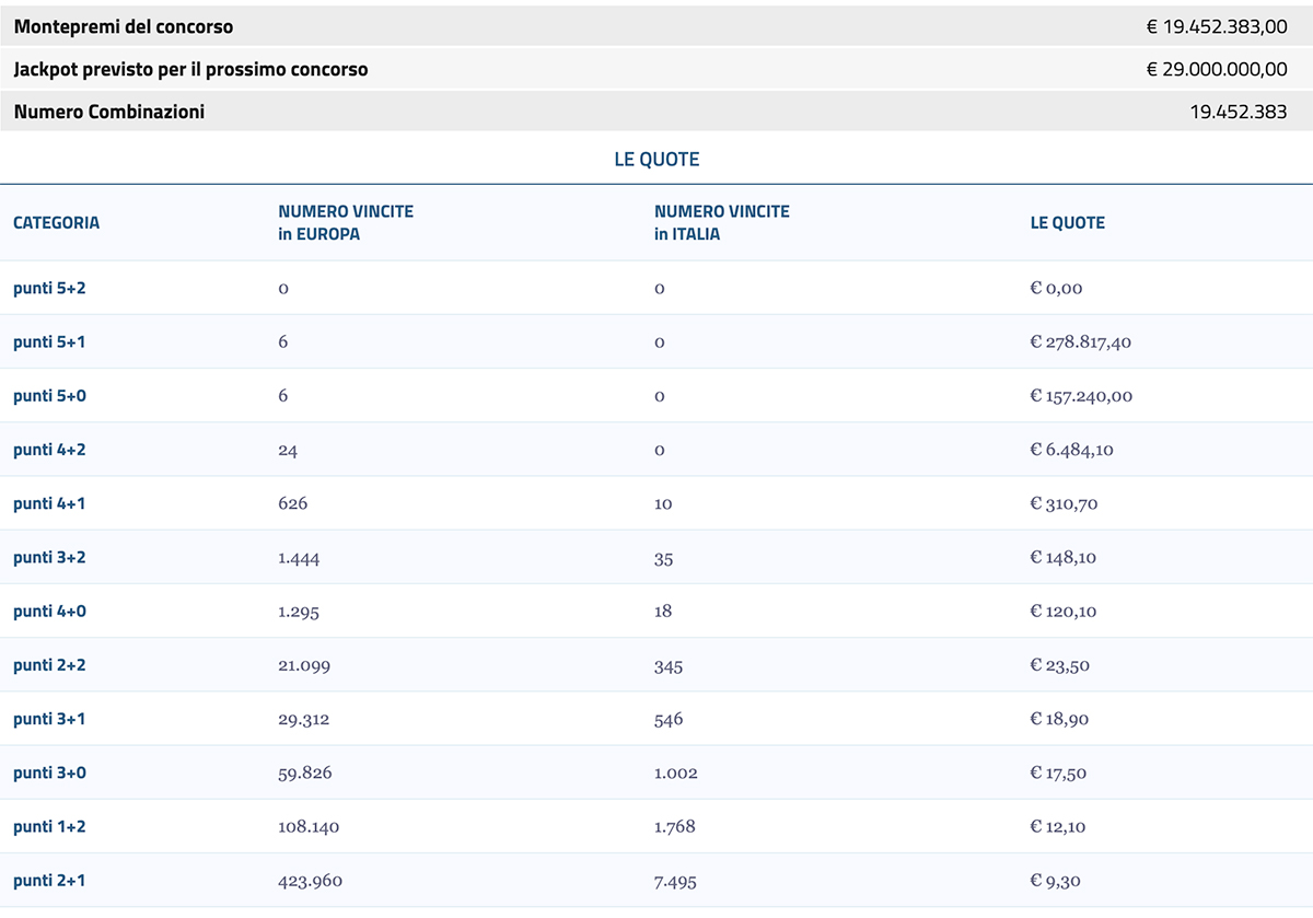 Dopo aver conosciuto i numeri Eurojackpot 10 novembre 2023 sempre su questa pagina sarà indicata la tabella con gli importi dei premi. Il valore delle quote dipende dall’importo del montepremi raccolto nell’ultima settimana. Per la riscossione dei premi è necessario recarsi in ricevitoria. Ricordiamo che quanto si vince, lo si può facilmente intuire dalla tabella contenente tutte le quote del concorso odierno. Infatti ci sono ben 12 categorie di vincita. Tante sono le possibili combinazioni vincenti che possono essere realizzate grazie alla cinquina ed alla coppia di euro numeri. L’appuntamento per conoscere i risultati dell’Euro jackpot è alle 20.00. La tabella si conoscerà 30 minuti dopo la combinazione vincente di oggi.