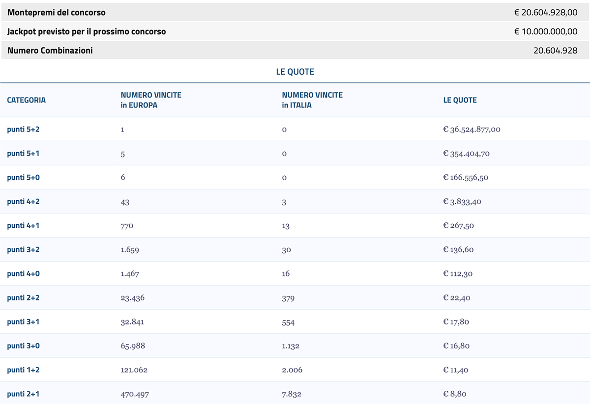 Al seguente link i risultati del concorso ultimo di martedì 14 novembre 2023. La pubblicazione delle vincite del concorso di stasera avverrà intorno alle 21.00. Sono necessari diversi minuti prima che siano indicati in maniera ufficiale gli importi di tutte le vincite. Anche in questo caso è sempre Sisal a diffondere i risultati che interessano tutti coloro i quali hanno indovinato almeno tre numeri vincenti tra quelli estratti. Infatti ricordiamo che per vincere è necessario indovinare almeno la combinazione 2 + 1 oppure 1 + 2. Per poter riscuotere i premi bisogna recarsi in ricevitoria ed esibire la combinazione vincente. Ricordiamo che i limiti degli importi da poter riscuotere in contanti sono quelli indicati nel regolamento, ma anche dalla stessa legge. Chi invece ha preso parte alle estrazioni attraverso la modalità on-line, allora potrà vedersi accreditare direttamente la vincita sul proprio conto di gioco.