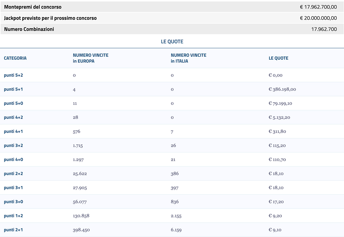 E’ Sisal che ogni venerdì sera gestisce uno dei giochi più coinvolgenti d’Europa, al quale prendono parte Italia, Olanda, Danimarca, Germania, Finlandia. Ma anche Slovenia, Estonia, Spagna, Svezia, Norvegia, Croazia, Islanda, Lettonia, Lituania, Ungheria, Repubblica Ceca, Slovacchia e Polonia. Sono 18 i Paesi in gara per conquistare il grande Jackpot in palio ogni venerdì. Vincere non è facile, come indicano le probabilità. E da quando il Superenalotto europeo è nato, l’Italia è riuscita a vincere il premio più ricco solamente due volte.