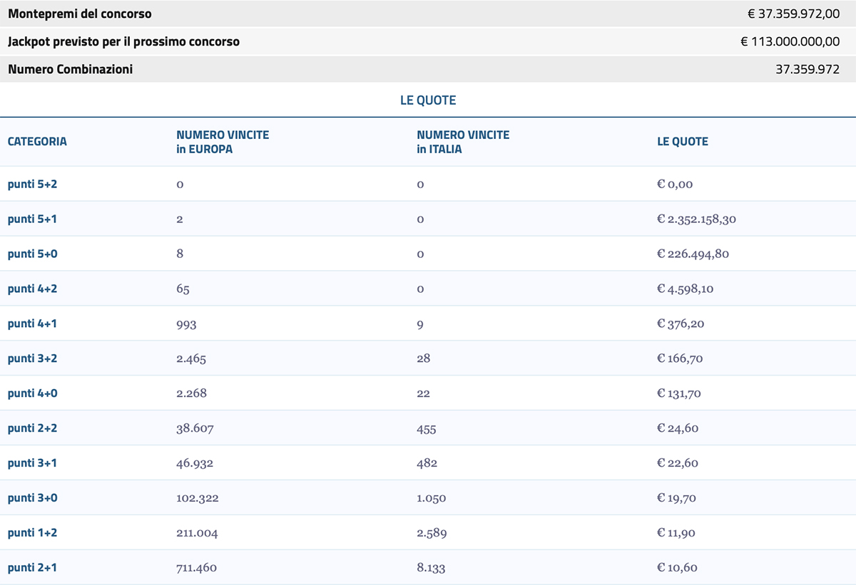 Durante il concorso precedente nessuno ha indovinato il risultato vincente. Per prendere parte al Superenalotto europeo, basta recarsi in uno dei punti vendita Sisal e tentare la sorte attraverso le molteplici possibilità di partecipazioni offerte dal regolamento ufficiale di gioco.