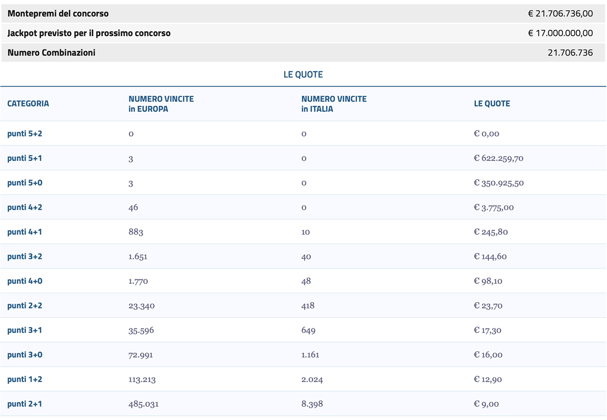 Subito dopo aver conosciuto il risultato di stasera della lotteria europea, saranno pubblicati dopo pochi minuti anche tutti i premi di categoria. Sono 12 le possibili combinazioni vincenti. Ogni settimana è possibile vincere indovinando la combinazione da 2+1, che è quella di importo inferiore fino al 5+2, che è invece il jackpot in palio.