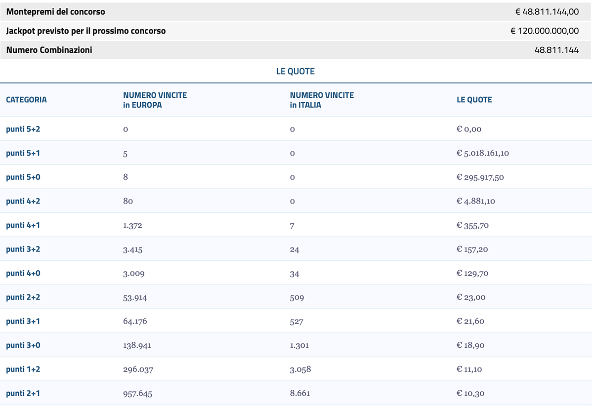 Nell’ultimo concorso di martedì 9 gennaio 2024 nessuno ha centrato la combinazione vincente. Sono però da segnalare quattro “5+1” da 5.142.221,90 euro ciascuno, due in Germania, uno in Finlandia e uno in Danimarca. Realizzati anche ventuno “5+0” da 84.116,70 euro ciascuno.
