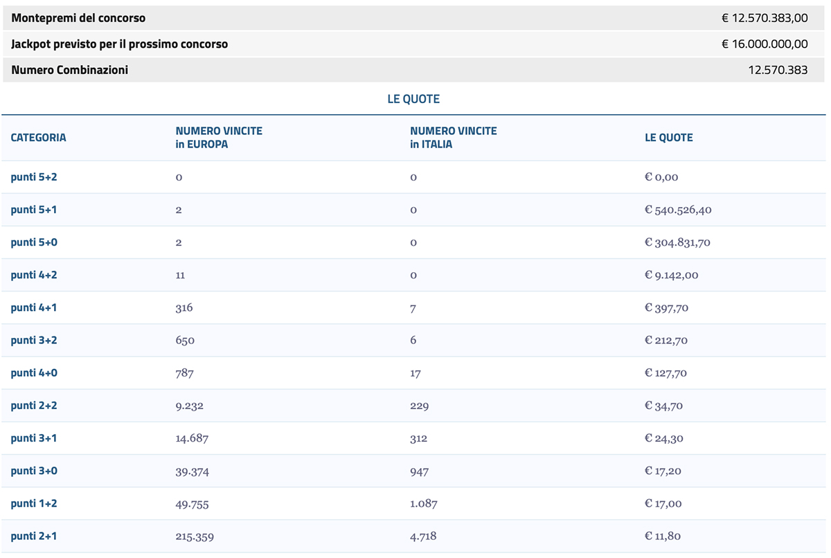 La pubblicazione delle quote del concorso Eurojackpot 13 Febbraio 2024  avverrà a distanza di qualche minuto rispetto a quella della combinazione vincente. Ricordiamo che ci sono 12 categorie di vincita, e per ciascuna delle quali è previsto un premio di importo variabile.
