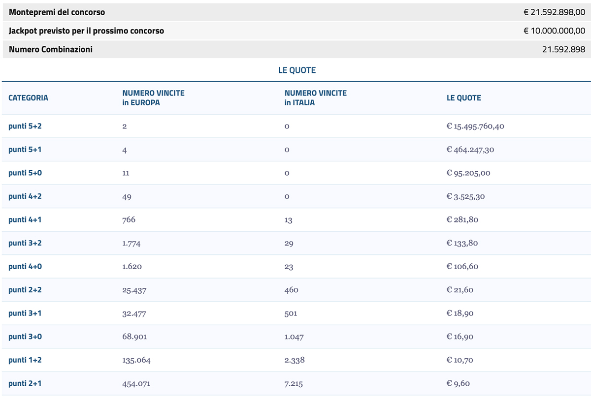 In compenso però sono ben 12 le categorie di vincita. Quindi anche se non si riescono ad indovinare tutti i numeri fortunati, si ha comunque la possibilità di poter realizzare una ricca vincita, anche attraverso altre combinazioni numeriche. Salire sul podio dei vincitori resta comunque molto difficile, in quanto le probabilità di indovinare la combinazione 5 + 1 è una su 5.959.013. Allo stesso modo indovinare la combinazione punti 5 + 0 è una su 3.405.150. Chi indovina invece tre numeri su sette, riesce comunque a portare a casa un premio in denaro il cui importo è variabile. Le quote, infatti, non sono fisse. Gli importi variano in base alla raccolta delle scommesse di gioco avvenute nell’ultima settimana.