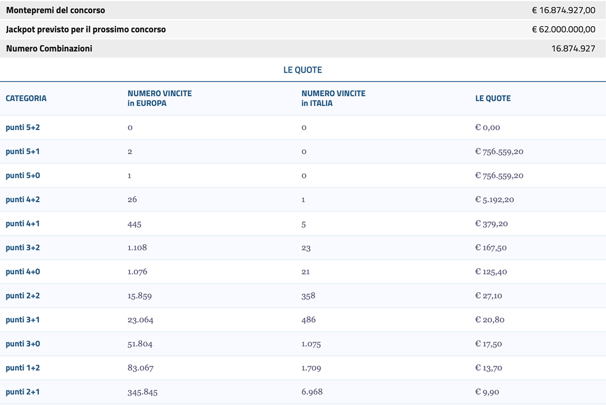 La scorsa settimana, a sfiorare questo importante traguardo è stato proprio un giocatore italiano. Nel concorso di venerdì nessun “5+2”, centrati cinque “5+1” in Germania (2), Polonia (2) e Svezia da 408.881,80 euro l’uno. Da segnalare anche quattordici “5+0” da 82.353,60 euro ciascuno, di cui due centrati in Italia, uno a Bari e uno a Roma. Per il prossimo concorso, il Jackpot in palio sarà di 51 milioni di euro.
