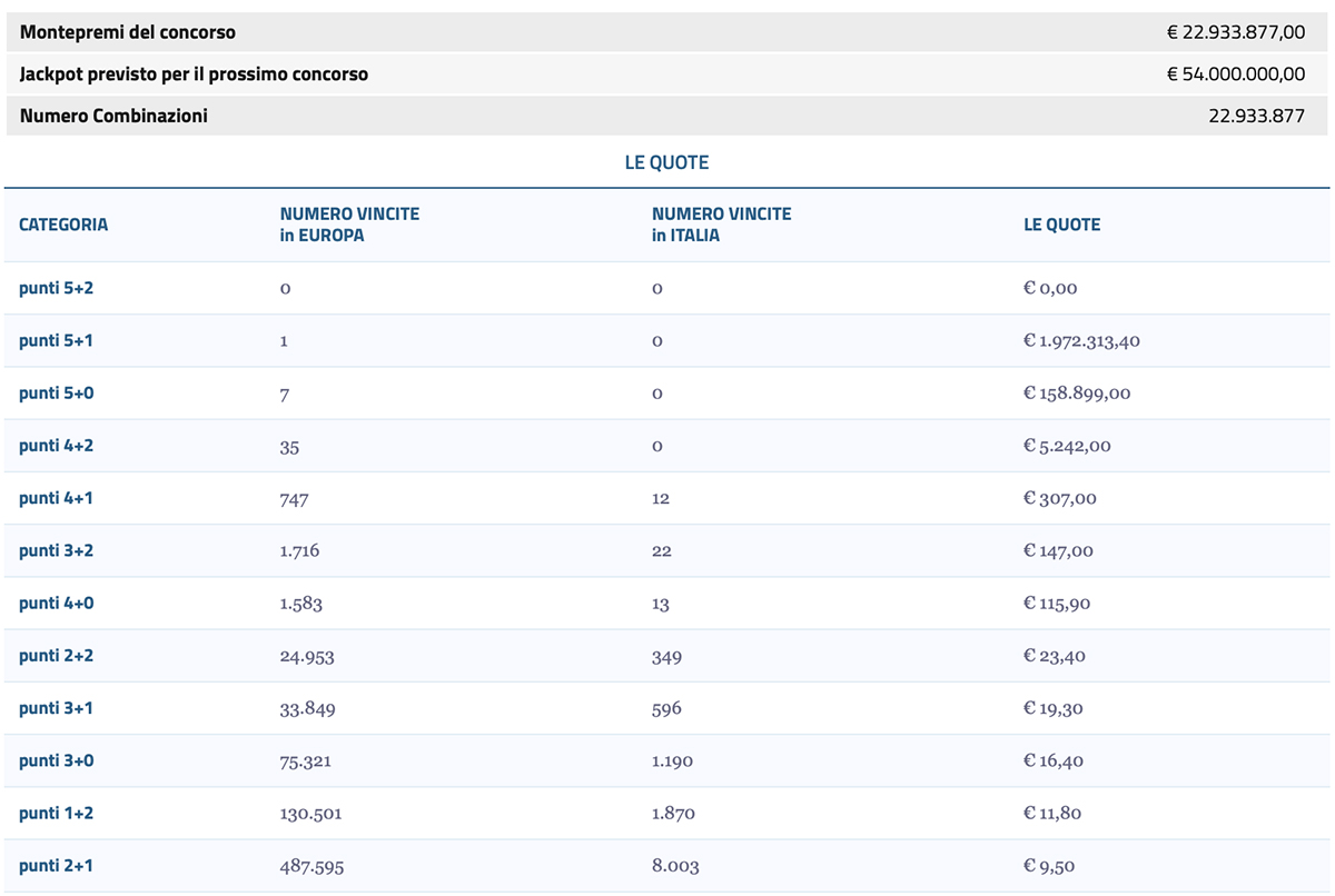 La ricevitoria è anche luogo in cui avviene la riscossione dei premi entro i termini previsti dal regolamento ufficiale. La lotteria europea ha 12 categorie di vincita. Per ciascuna  sono previste diverse probabilità. Ogni giocatore ha una probabilità su 95.344.200 di diventare autore della vincita del jackpot di stasera martedì 1 agosto 2023. Invece la probabilità di aggiudicarsi il premio di categoria più bassa è una su 42.