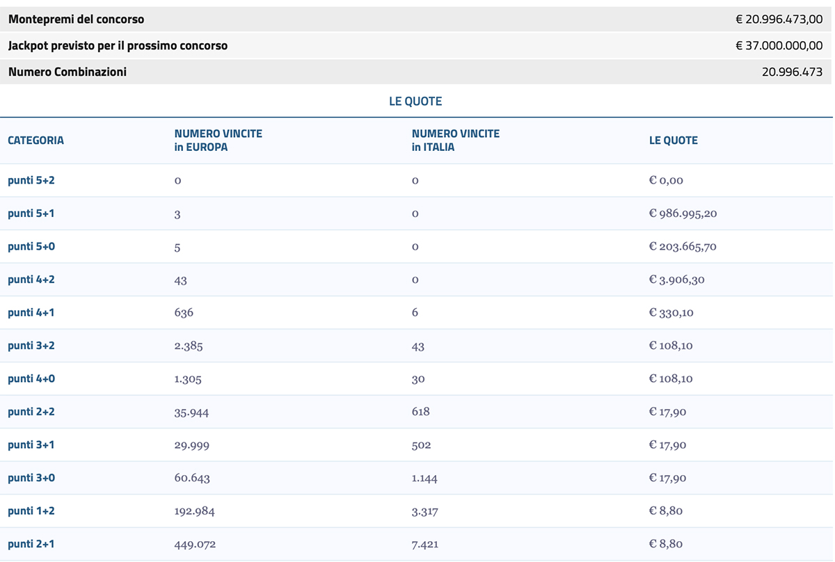 I numeri Eurojackpot in diretta stasera saranno seguiti dopo circa mezz’ora dalla tabella contenente gli importi delle quote in palio al concorso 24 24. Dopo aver indicato la combinazione vincente del giorno, il sistema procederà al calcolo degli importi delle vincite. Dividerà l’importo del montepremi raccolto nell’ultima settimana, per il numero dei vincitori di ciascuna categoria di premio.