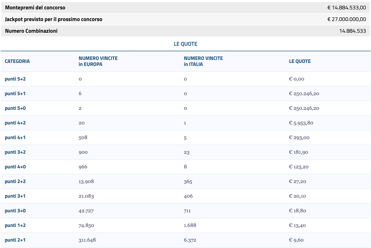 Durante il concorso precedente, nessuno ha indovinato il risultato vincente. Per prendere parte al Superenalotto europeo, basta recarsi in uno dei punti vendita Sisal e tentare la sorte attraverso le molteplici possibilità di partecipazioni offerte dal regolamento ufficiale di gioco.