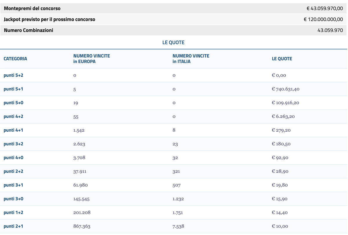 I premi possono essere riscossi presso qualsiasi ricevitoria. Una volta verificata la vincita delle estrazioni Eurojackpot 19 Aprile 2024, non resta che passare presso un punto vendita Sisal per intascare la vincita. Per i premi che non superano i € 520 il pagamento può avvenire in contanti. Chi gioca on-line invece riceverà l’accredito della vincita direttamente sul proprio conto di gioco. Ricordiamo anche che è possibile riscuotere un premio entro il 60ª giorno successivo alla pubblicazione del bollettino ufficiale generale. La scadenza è protratta fino al 90º giorno per chi si reca presso gli uffici premi di Sisal S.p.A. Le estrazioni dell’Euro jackpot si svolgono il venerdì sera e i numeri vincenti possono essere trovati nella pagina dei risultati immediatamente dopo l’estrazione. È meglio controllare i biglietti il prima possibile per vedere se hai vinto un premio.
