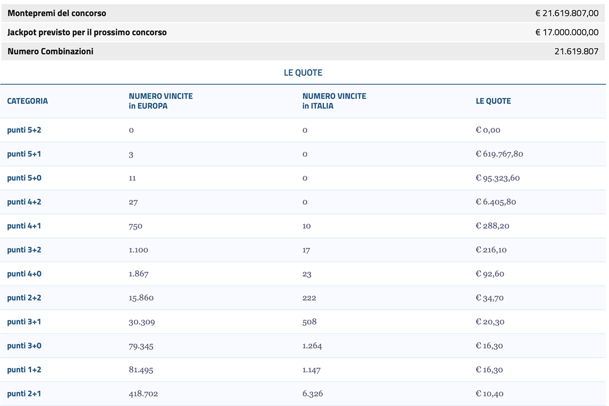 Gli importi dei premi del concorso odierno sono variabili. Sarà il montepremi di venerdì 26 aprile 2019 a stabilire quanto si vince stasera. D’altronde il regolamento è chiaro: la partecipazione alla lotteria europea è fissa. Le vincite in palio invece sono di importo variabile.