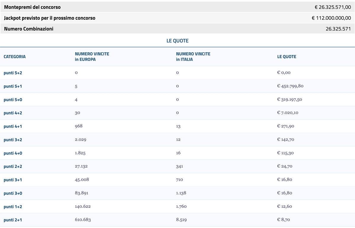 I premi relativi all’estrazione di oggi saranno noti 30 minuti circa dopo la pubblicazione della combinazione vincente. Dopo aver comunicato quali sono i numeri Eurojackpot 28 maggio 2024, Sisal procederà ad effettuare il calcolo delle quote relative al concorso di stasera.