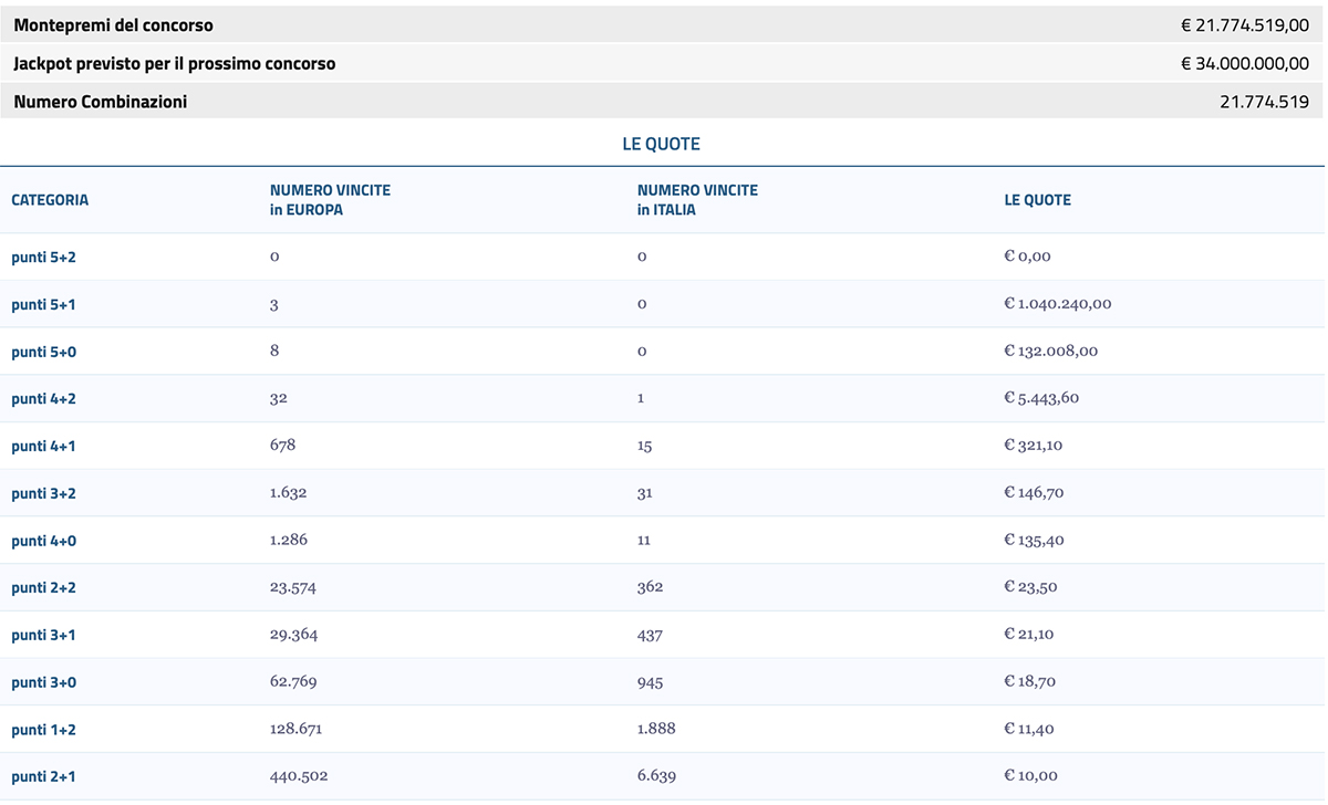 Schedina con risultati delle estrazioni Euro Jackpot: quote e montepremi