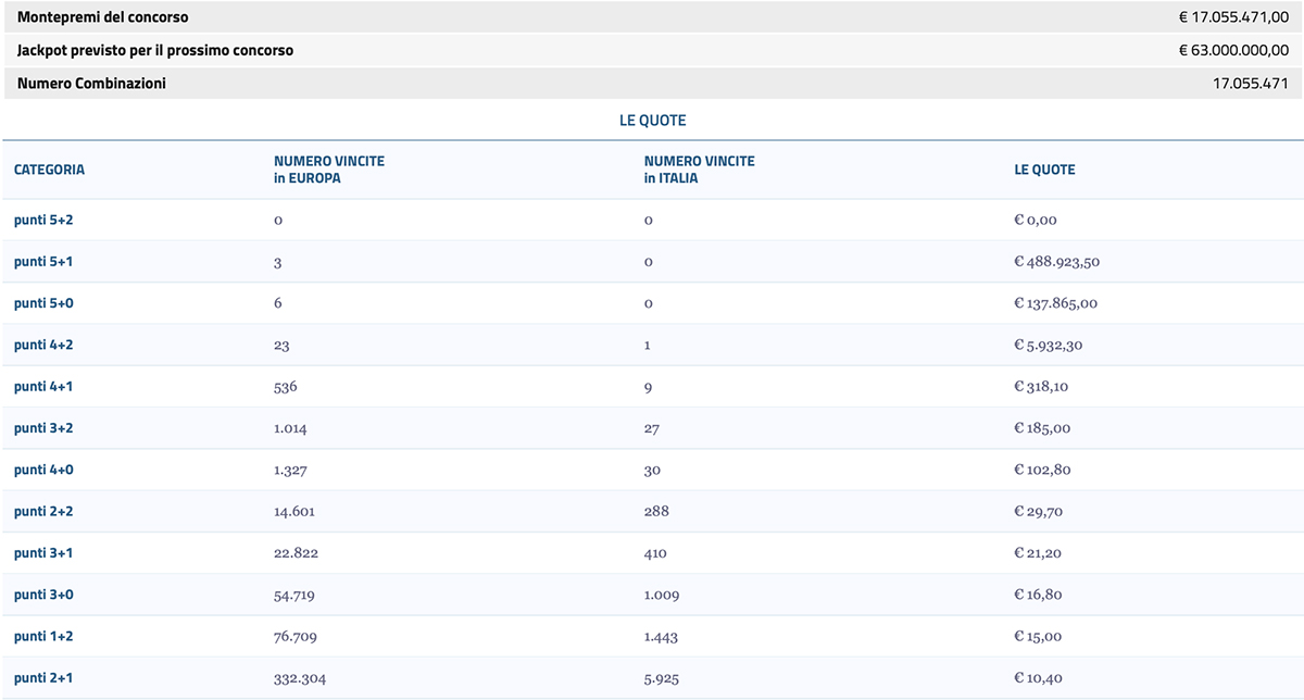 I premi possono essere riscossi presso qualsiasi ricevitoria. Una volta verificate le vincite di Eurojackpot 25 giugno 2024, non resta che passare presso un punto vendita Sisal per intascare la vincita. Per i premi che non superano i € 520 il pagamento può avvenire in contanti. Chi gioca on-line invece riceverà l’accredito della vincita direttamente sul proprio conto di gioco. Ricordiamo anche che è possibile riscuotere un premio entro il 60ª giorno successivo alla pubblicazione del bollettino ufficiale generale. La scadenza è protratta fino al 90º giorno per chi si reca presso gli uffici premi di Sisal S.p.A. Le estrazioni dell’Euro jackpot si svolgono il venerdì sera e i numeri vincenti possono essere trovati nella pagina dei risultati immediatamente dopo l’estrazione. È meglio controllare i biglietti il ​​prima possibile per vedere se hai vinto un premio.