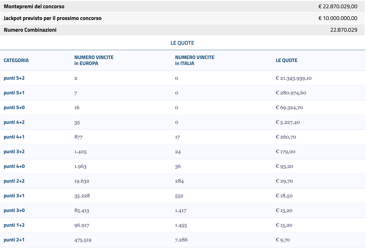 La tabella contenente tutte le vincite ed i premi relativi al sorteggio odierno sono segnalati intorno alle ore 21,00. La combinazione vincente il martedì solitamente è pubblicata intorno alle ore 20,20. Il regolamento dice che si vince con una quota minima di 2+1 che generalmente vale 8 €. E’ possibile giocare anche con i sistemi integrali e i sistemi integrali ridotti. In questo modo aumentano le probabilità di vincita come pure il costo del biglietto. Vista la popolarità della lotteria, è stata introdotta una nuova giornata di sorteggio settimanale, il martedì.