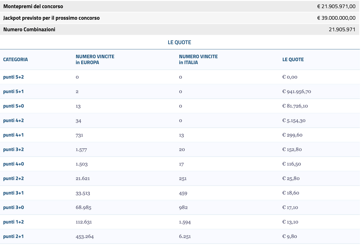 Durante il concorso precedente, nessuno ha indovinato il risultato vincente. Per prendere parte al Superenalotto europeo, basta recarsi in uno dei punti vendita Sisal e tentare la sorte attraverso le molteplici possibilità di partecipazioni offerte dal regolamento ufficiale di gioco.