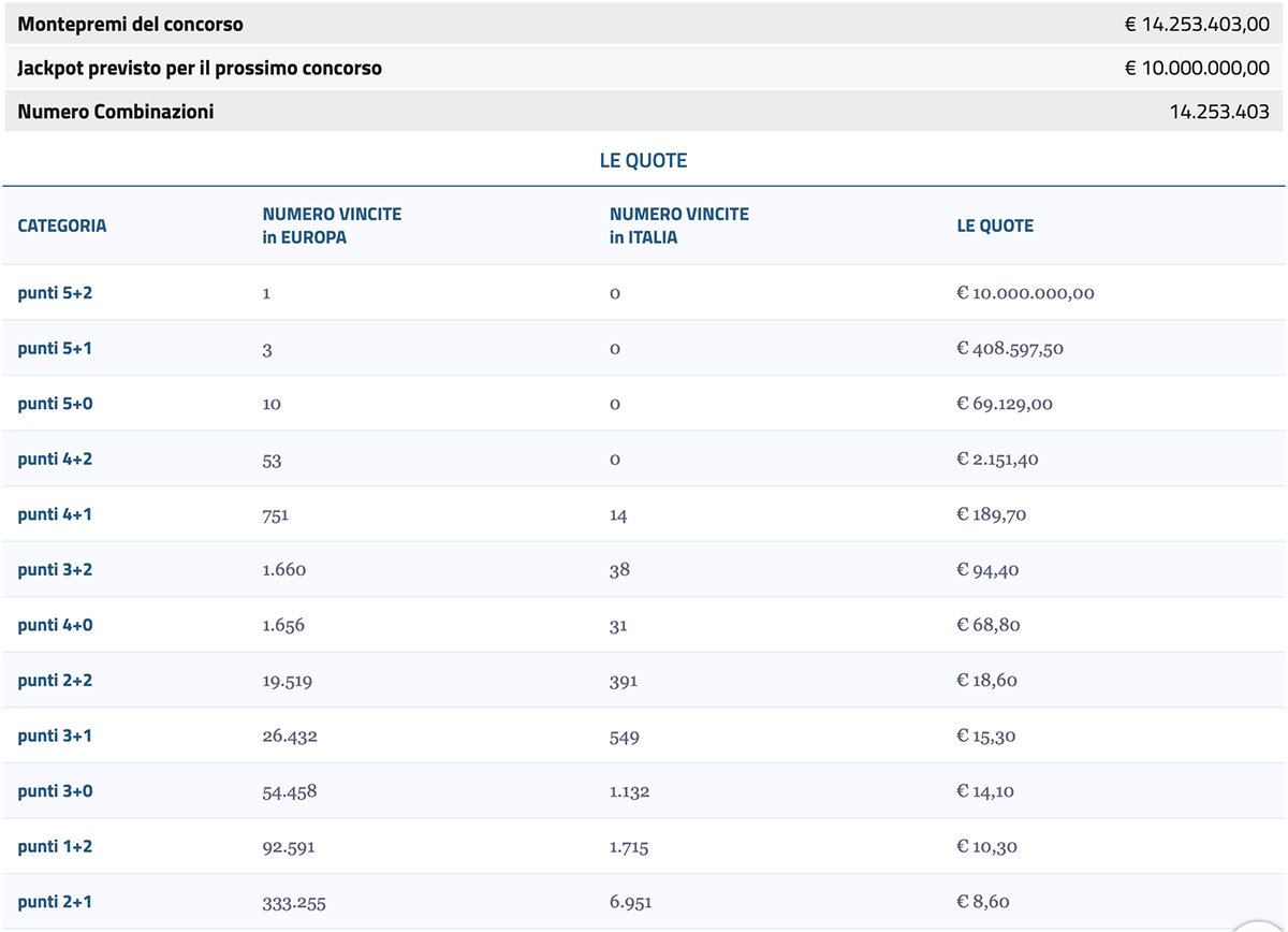 I Paesi europei che partecipano alla sfida sono Italia, Olanda, Danimarca, Germania, Finlandia, Slovenia, Estonia, Spagna, Svezia, Norvegia, Croazia, Islanda, Lettonia, Lituania, Ungheria e Repubblica Ceca. Con una giocata minima di 2 euro si ha la possibilità di avere 12 categorie di vincita e la probabilità di vincere almeno un premio è di 1 su 26. C’è un concorso a settimana, ogni venerdì alle ore 20.30. Si può giocare in ricevitoria, compilando la schedina o effettuando una giocata a voce rivolgendosi direttamente al ricevitore, oppure online sui siti autorizzati.