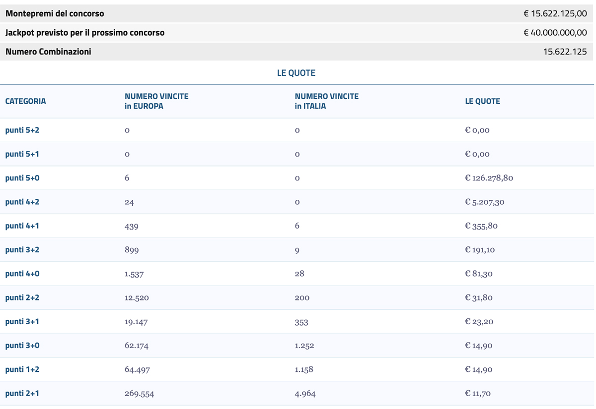Oggi 17 settembre 2024 al concorso Eurojackpot 37 24 di oggi potrebbero regalare tanti milioni di euro ad un nuovo fortunato giocatore. Su Controcampus.it c’è la pubblicazione degli ultimi estratti di stasera, e sarà possibile poi scoprire le varie categorie di vincita ed i vari importi dei premi stabiliti in base al montepremi raccolto.