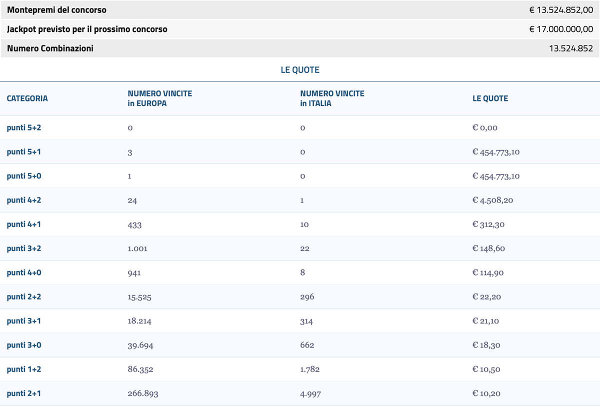 Alla combinazione vincente di oggi seguirà poi la tabella contenente gli importi delle vincite, proprio come nel concorso di venerdì. Le quote sono calcolate in base al numero dei vincitori ed al valore del montepremi raccolto nell’ultima settimana. Le categorie di vincita sono 12, in base ai numeri vincenti indovinati. Come per gli altri giochi di fortuna, anche alla lotteria europea è possibile prendere parte on-line. Per tentare la fortuna è necessario essere titolare di un conto di gioco. Sui siti abilitati alla raccolta delle scommesse di gioco, si può scegliere la modalità di partecipazione più in linea con i propri interessi. Per partecipare si può compilare la schedina virtuale selezionando i numeri fortunati. Ci sono poi le giocate casuali con il Quick Pick, oppure la bacheca dei sistemi on-line, per chi vuole aumentare le proprie probabilità di vincita con più combinazioni.