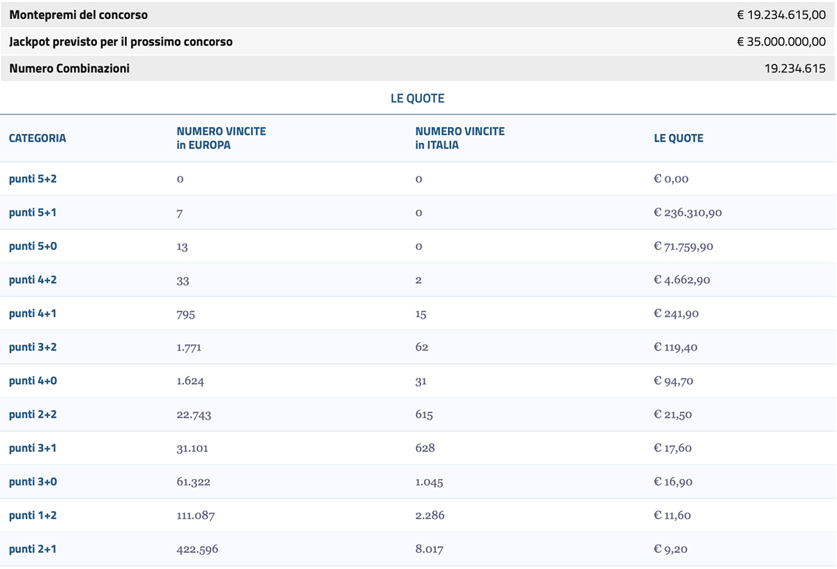 Sempre in ricevitoria si può tentare la sorte con il sistema Quick Pick, che prevede sempre la scelta di una combinazione casuale. In ultimo ricordiamo che la lotteria europea prevede anche la possibilità di acquistare in ricevitoria le schedine precompilate che recano una combinazione numerica già stampata sul fronte. A prescindere dalla opzione di gioco prescelta, il costo della giocata minima è di € 2.