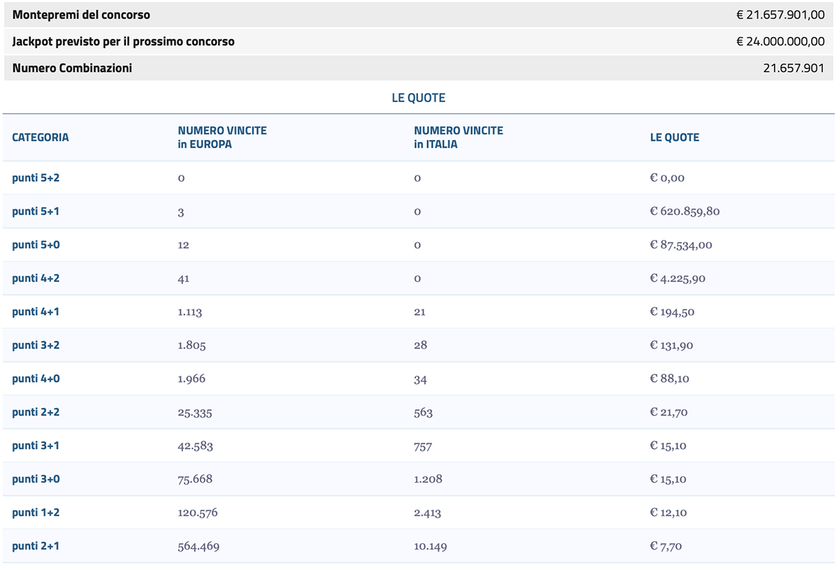 Per vincere il primo premio all’euro Jackpot oggi bisogna indovinare la combinazione punti 5 + 2. Ma è possibile diventare milionari anche grazie ai premi di categoria inferiore. Nell’ultimo concorso non c’è stato nessun “5+2” nel concorso ultimo. Nell’ultima estrazione, da segnalare cinque “5+1” da 5.018.161,10 euro ciascuno, in Germania, Finlandia, Norvegia, Olanda e Spagna. Realizzati anche otto “5+0” da 295.917,50 euro ciascuno, sei in Germania e due in Svezia.