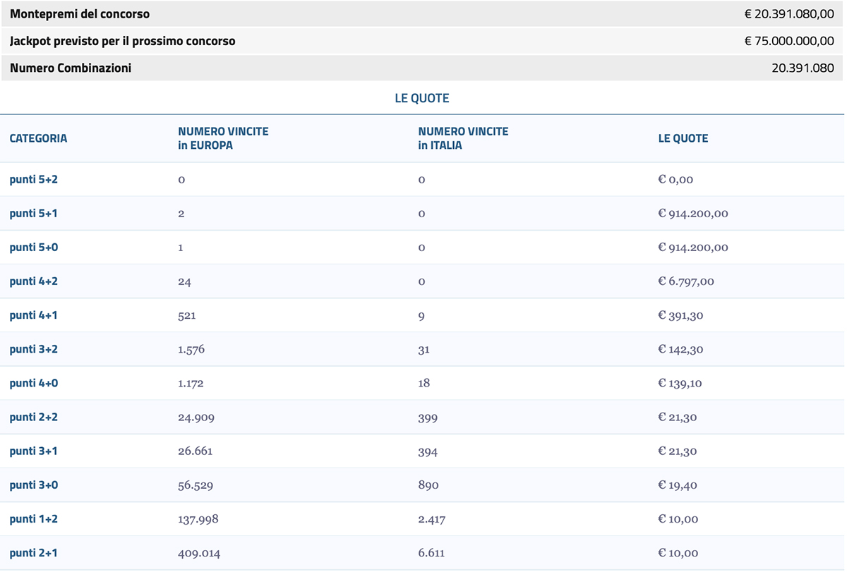 Per coloro che hanno indovinato i cinque numeri estratti ed un Euronumero la vincita ammonta a 334.853,10 euro per ognuno. Due di loro hanno partecipato al gioco in Danimarca, due in Svezia, due in Ungheria ed uno in Olanda. Coloro che hanno centrato il “5+0” sono sette, distribuiti tra la Polonia, la Germania, la Croazia e la Repubblica Ceca e ognuno di loro vanta un premio da 118.183,40 euro.