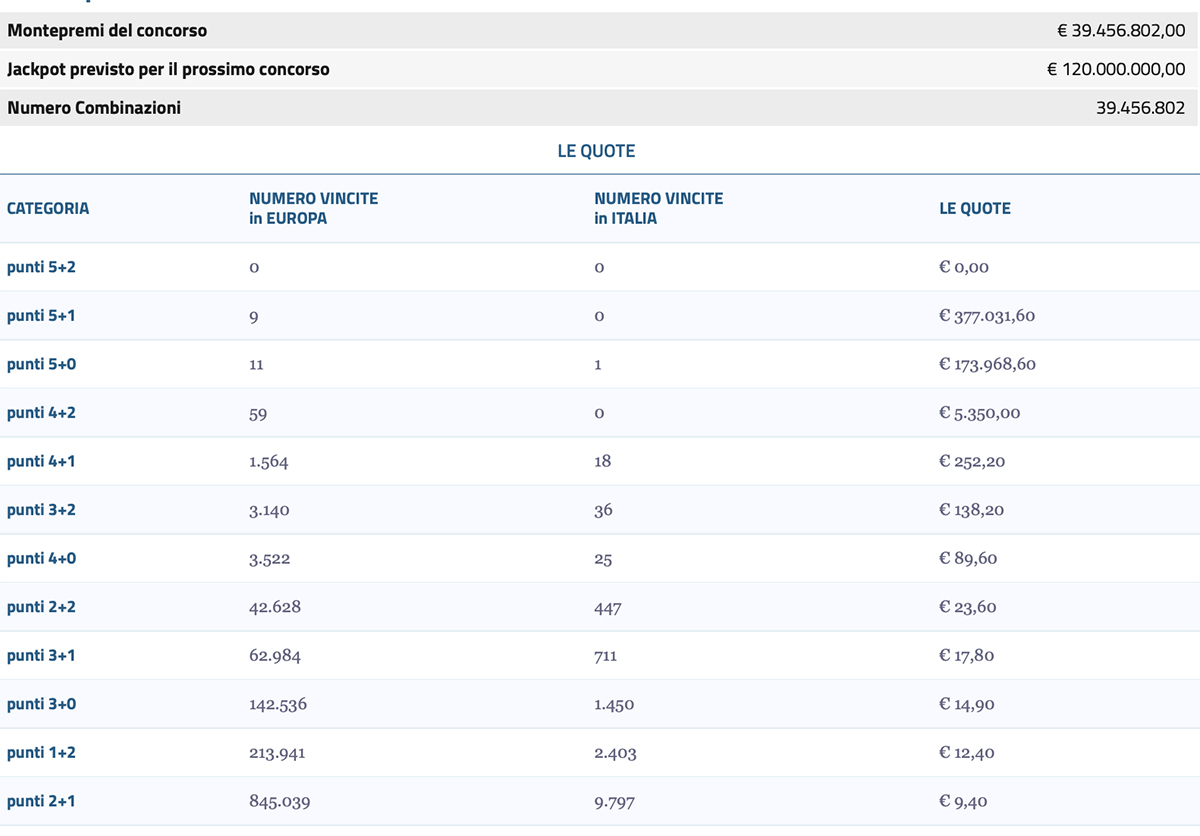 La combinazione vincente, infatti, è detta 5+2. Il sorteggio fisico delle cifre avviene ad Helsinki, capitale della Finlandia. Da lì, poi i risultati sono diffusi in tutta Europa. Il regolamento indica la ripartizione del montepremi secondo precise percentuali. In generale ai giocatori è utile sapere che le categorie di premi sono 12: alla prima categoria di premi appartengono le combinazioni di gioco per le quali risultano esattamente pronosticati tutti i cinque numeri estratti, e tutti i due Euronumeri, e così via.