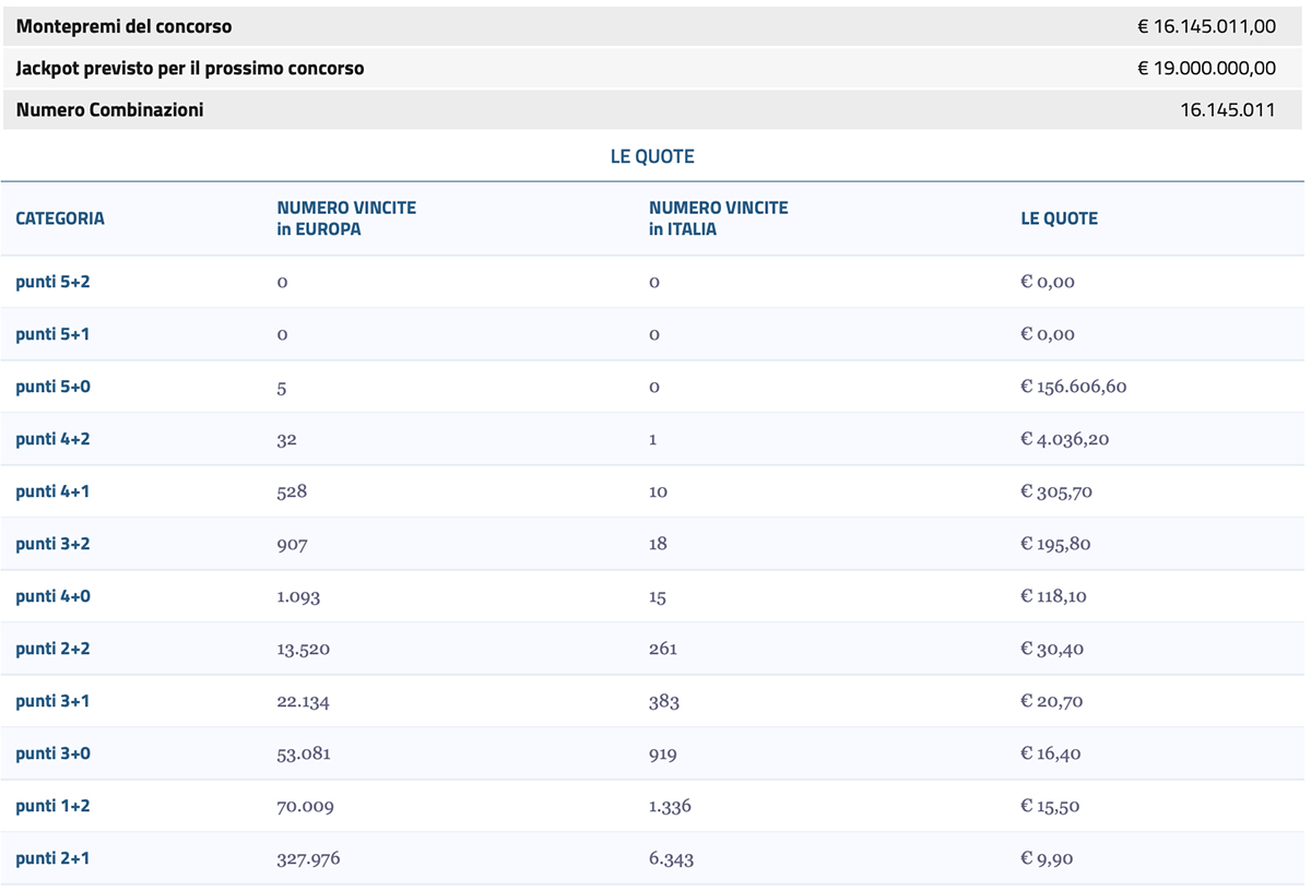 Dopo aver conosciuto la combinazione vincente del concorso, non resta che scoprire gli importi dei premi. Le vincite saranno indicate circa 30 minuti dopo la pubblicazione della combinazione vincente. Per la riscossione delle vincite basta recarsi in ricevitoria, oppure ottenere l’accredito del premio direttamente sul proprio conto di gioco nel caso in cui la giocata sia stata effettuato on-line. Da circa un mese è possibile giocare anche di martedì alla lotteria europea. Sempre alle ore 20,00, raddoppia l’appuntamento con il gioco più seguito di Europa. Inoltre altra importante novità che ha aumentato la notorietà della lotteria, è che il primo premio in palio può adesso raggiungere l’importo massimo di 120 milioni di euro, e non fermarsi più quindi nella sua ascesa a 90 milioni di euro.
