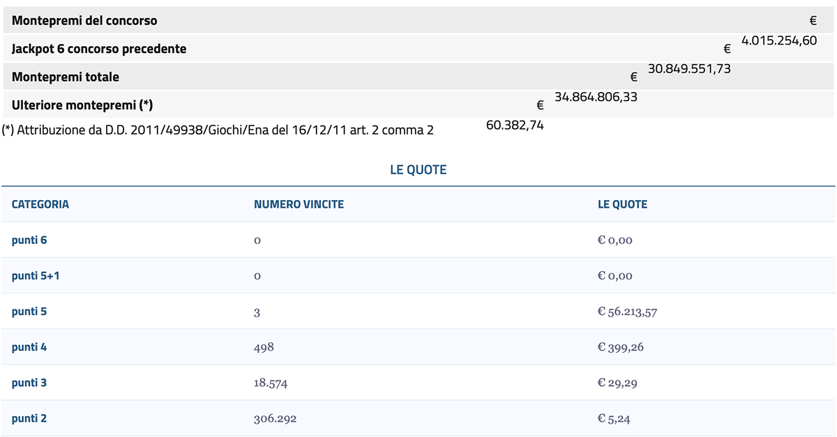 Nessun “6” nel concorso ultimo e il Jackpot sale a tanti milioni di euro. Sono sei i punti “5” centrati con i fortunati vincitori che si portano a casa 37.536,90 euro a testa. Da segnalare anche cinque “4 stella” da 29.113 euro ciascuno. A chiudere la diretta estrazioni del Lotto e Superenalotto di oggi, quote e premi del concorso 57 della lotteria di Sia. Si scoprirà subito chi ha vinto e dove.