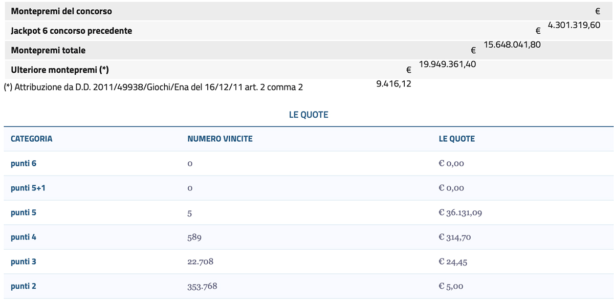 Nessun “6” nel concorso ultimo e il Jackpot vola a 225,2 milioni di euro. Sono dodici i punti “5” centrati, con i fortunati vincitori che si portano a casa 22.590,03 euro a testa. Da segnalare anche quattro “4 stella” da 21.456 euro ciascuno. L’ultimo “6” da 156 milioni di euro è stato centrato a Montappone (FM). Attesa quindi per i numeri dell’ultima estrazione del Lotto e Superenalotto, quote e vincite possono essere riscosse secondo le seguenti regole.