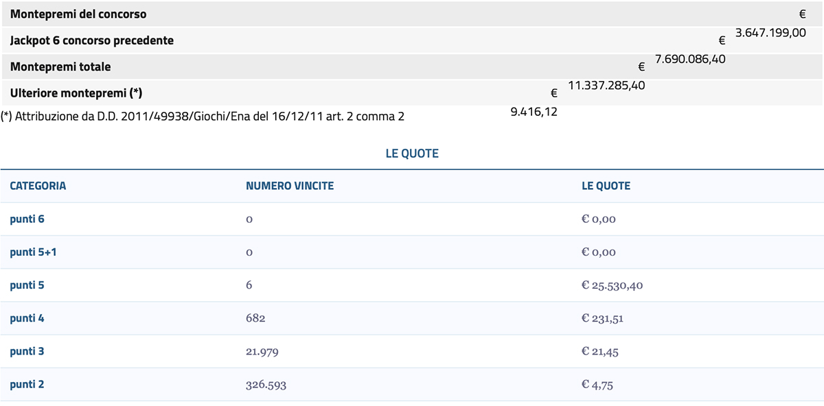 Il concorso  premia Pozzuoli, in provincia di Napoli, dove sono stati vinti 97.500 euro grazie a tre ambi e un terno (7-21-23). Campania fortunata visto che a Napoli un altro fortunato giocatore ha centrato tre ambi e un terno per una vincita da 11.875 euro.