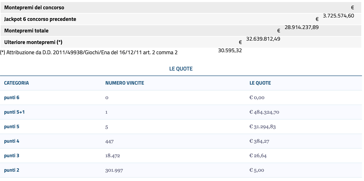 Nessun “6” nell’ultimo sorteggio della settimana del SuperEnalotto e il Jackpot sale a tanti milioni di euro. Nel concorso ultimo centrato un “5” da 194.114,42 euro realizzato a Buguggiate, in provincia di Varese, presso la Tabaccheria Ricevitoria Bar Giardino. Da segnalare anche sei “4 stella” da 37.244 euro ciascuno da riscuotere.