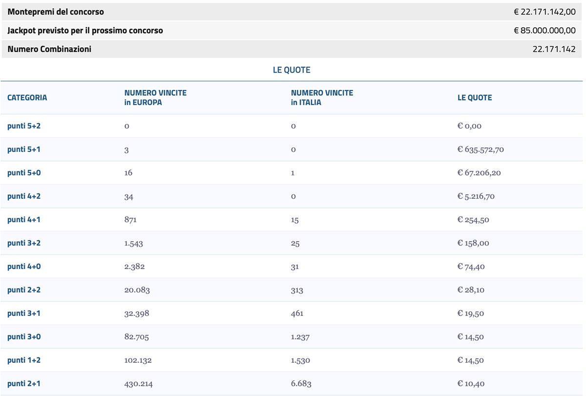 I premi delle estrazioni Eurojackpot di oggi saranno pubblicati pochi minuti dopo i risultati ufficiali di venerdì 15 luglio. Ricordiamo che per vincere occorre indovinare almeno tre numeri vincenti. Stando a quanto dichiarato dal concessionario di gioco sul sito ufficiale, la probabilità di vincere almeno un premio è 1 su 26, considerando tutte le categorie.