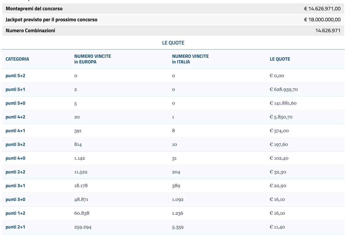 Le quote di stasera saranno disponibili a partire dalle ore 21,00. Ricordiamo che, in caso di vecchie schedine, tutte le estrazioni euro jackpot possono essere verificate nell’archivio. Sul sito Sisal sono presenti anche tutte le informazioni necessarie per capire come si gioca alla lotteria europea. Ma anche quanto si vince. Infatti ci sono ben 12 premi di categoria, che possono essere vinti in base alla combinazione fortunata che si riesce a pronosticare correttamente.