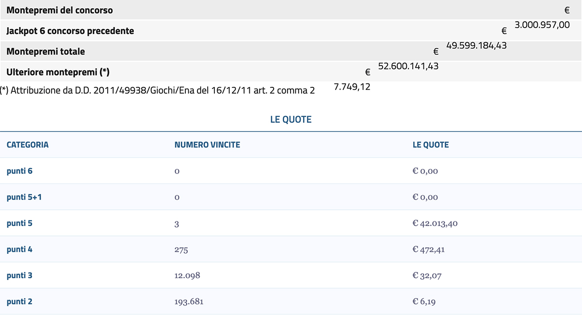 L’ultimo concorso premia Vercelli, in Piemonte, dove un fortunato giocatore si è portato a casa 62.500 euro centrando sei ambi, quattro terni e una quaterna. Festa anche in Puglia, dove si registrano due vincite: la prima da 23.750 euro a Polignano a Mare, in provincia di Bari, arrivata con tre ambi e un terno mentre la seconda premia un giocatore di Taviano, in provincia di Lecce, dove è sono stati centrati quattro ambi e un terno per un premio di 13.800 euro. E’ la Toscana la grande protagonista dell’ultimo concorso del 10eLotto: nell’estrazione del 15 settembre, infatti, sono stati centrate ben quattro vincite per un totale di 22.500 euro. L’ultimo concorso del 10eLotto ha distribuito premi per 21,4 milioni di euro per un totale di oltre 2,5 miliardi da inizio anno.