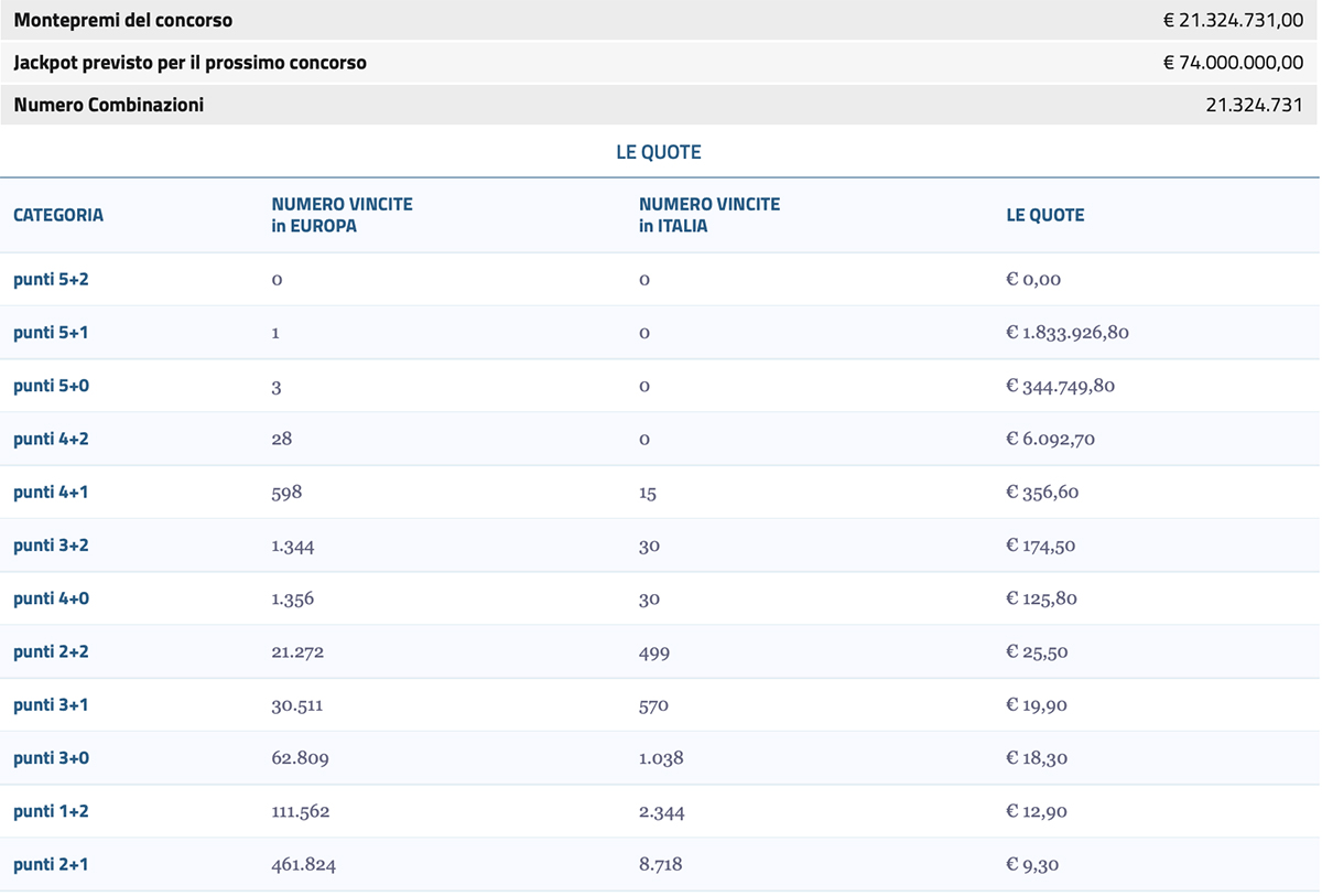 Di seguito sono riportate le quote dell’ultima estrazione e la distribuzione dei premi per categorie. La tabella dei risultati di questa pagina ci mostra la distribuzione dei premi. Corrispondono a ciascuna delle 12 categorie di premi che il gioco prevede. La tabella indica le varie combinazioni di numeri che devono essere realizzate per avere diritto a ricevere il premio.